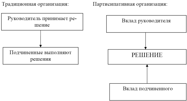 · Партисипативная – организация, использующая участие работников в управлении. Тем самым обеспечивается мотивированность их труда. Обостряется чувство собственника. В таких организациях работники могут: