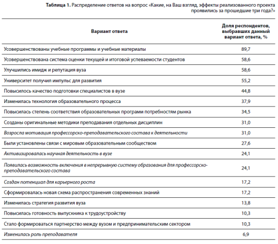 Респонденты склонны высоко оценивать краткосрочные результаты проекта, чем предполагать, каково будет воздействие результатов и ряда элементов инновационной среды на будущую карьеру. Текущая профессиональная деятельность также активизировалась и стала более разнообразной. 89,7% опрошенных преподавателей пришли к выводу, что такая задача проекта, как повышение квалификации, решена полностью или практически полностью. Более того, в ходе реализации проекта преподаватели продемонстрировали свою готовность к активной академической мобильности, что является одним из сигналов для отслеживания современных профессиональных ценностей. В ходе проведения опроса было важно узнать взгляды респондентов на эффекты от реализации проекта, проявившиеся в прошедшие три года с момента его завершения, т.е. в 2005–2008 гг.