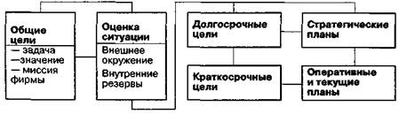 Следующая фаза процесса планирования не менее важна и предполагает поиск долгосрочных целей и разработку стратегических планов. Стратегический план включает в себя описание основных планов организации на период в 1–5 лет. Кроме того, в этом плане описывается количество и сроки капиталовложений в развитие фирмы приблизительно на тот же период времени. Как это можно видеть по схеме 1, долгосрочные цели устанавливаются после проведения досконального анализа всех возможных вариантов развития производства. Эти возможности возникают из взаимодействия внешнего окружения фирмы и элементов ее внутренней структуры. В результате анализа менеджер определяет рыночный потенциал, пути его реализации, варианты распределения ресурсов и обязательства перед акционерами.