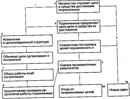 1. Менеджеры и их подчиненные устраивают первоначальное собрание, на котором менеджеры обрисовывают предварительные общеорганизационные и более мелкие цели. Подчиненных просят подумать об этих целях и о том, каковы должны быть их конкретные цели, необходимые для достижения общеорганизационных.