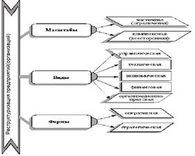 Процесс реструктуризации можно рассматривать как способ снятия противоречий между требованиями рынка и устаревшей логикой действий предприятия. По существу, реструктуризация предприятия — это осуществление организационно-экономических, правовых и технических мероприятий, направленных на: изменение структуры предприятия, управления им, форм собственности, организационно-правовых форм; финансовое оздоровление, увеличение объема выпуска конкурентоспособной продукции, повышение эффективности производства.