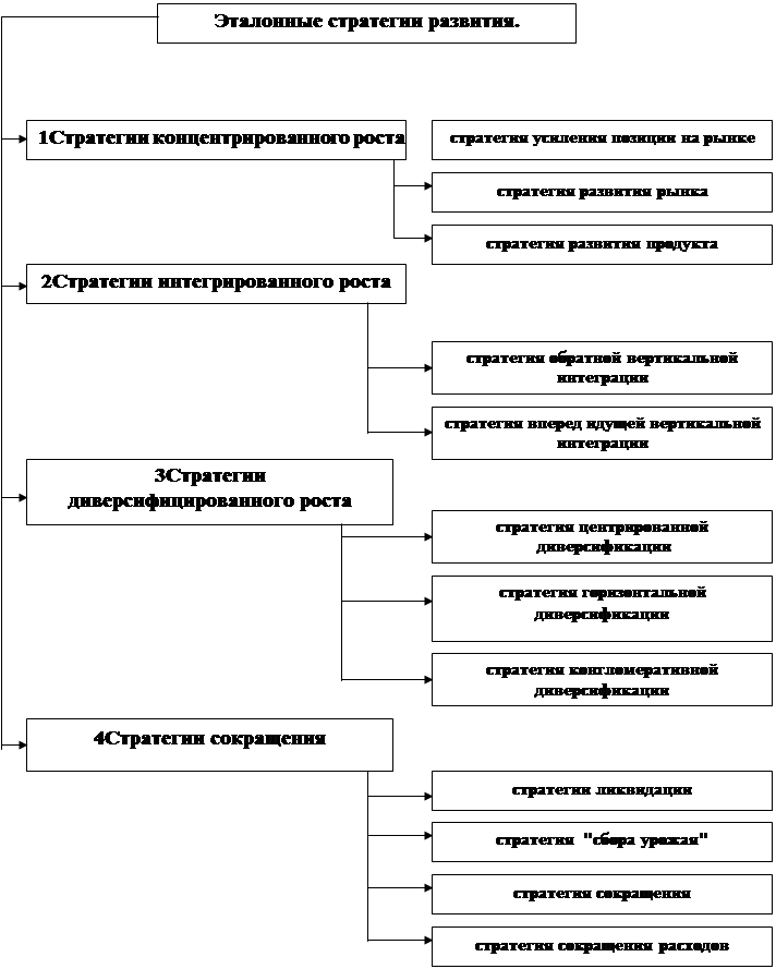 Существует несколько групп эталонных стратегий развития бизнеса. К первой группе относятся стратегии концентрированного роста, ко второй - стратегии интегрированного роста, к третьей - стратегии диверсифицированного роста, и наконец, к четвертой - стратегии сокращения.