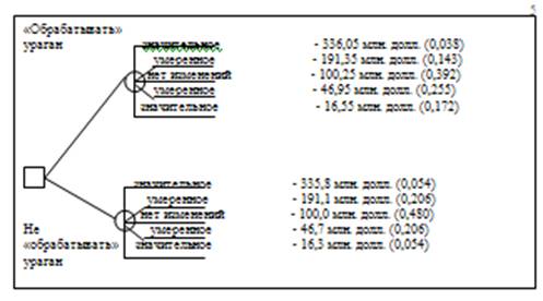 Вероятности каждого из этих исходов проставлены в скобках возле стоимости ущерба. Если же правительственное ведомство выбирает нижнюю ветку дерева решений, соответствующую решению не "засевать" ураган, то далее возможны те же пять исходов. Имущественный ущерб, соответствующий каждому из этих исходов, а также их вероятности проставлены на правом конце из веток.