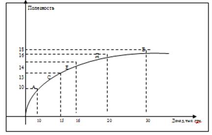 Приведенный рисунок показывает, что уровень полезности растет с 10 до 18 единиц по мере роста дохода с 10 000 грн. до 30 000 грн. При этом предельная полезность постепенно уменьшается.