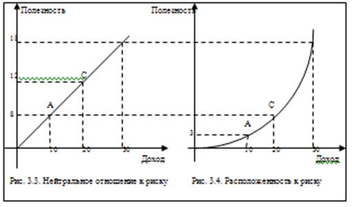 Рис. 3.4 отражает расположенность к риску. В данном случае ожидаемая полезность дохода от владения пакетом акций выше, чем полезность стабильного дохода. В числовом выражении это выглядит следующим образом: