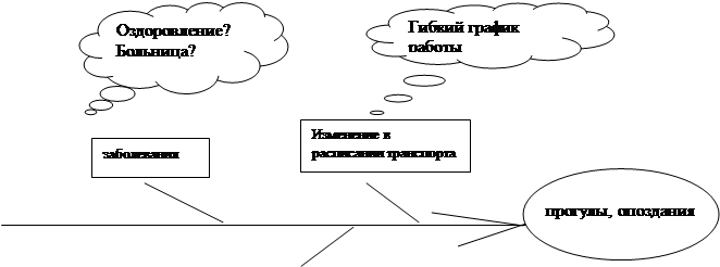 Причинно – следственная диаграмма, которая иллюстрируется «рыбьим скелетом». В голове «рыбы» - проблема, а в «костях скелета» - возможные причины проблемы, около каждой причины указываются способы ее устранения. Пример приведен на рис.2.