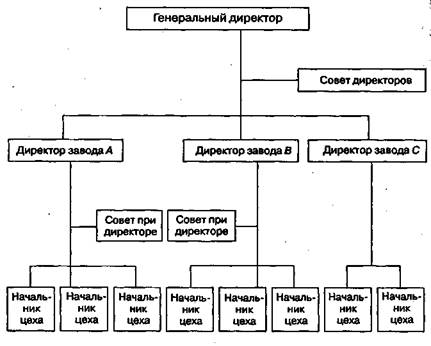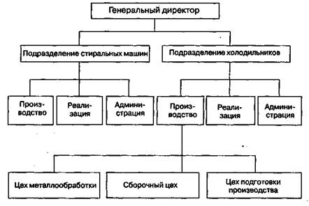 В данном случае структура в значительно большей степени, чем чисто линейная структура, дифференцирована по горизонтали. Подобная структура целесообразна в случаях, если организация производит несколько (два и более) ярко выраженных отдельных продуктов, разделяемых в технологическом процессе или в ходе взаимодействия с внешней средой. Например, автомобилестроительное предприятие выделяет отдельное структурное подразделение, которое занимается только производством двигателей. В таких организациях возможно использование специалистов - узких профессионалов, а также внесение изменений в производство одного продукта без изменения технологии и структуры всей организации.