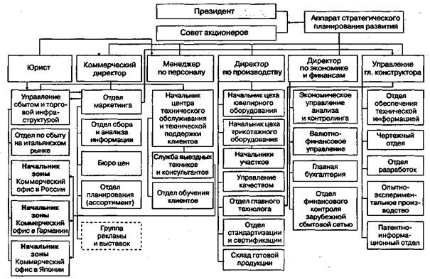 Продуктовая структура представляет собой линейную организационную структуру, которая четко подразделяется по горизонтали на несколько достаточно специфических линейных структур, ориентированных на выпуск одного вида продукта. Общий вид такой структуры изображен на рис. 2.2 (приложение 3).