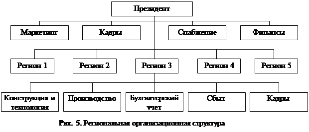 особенно привлекательна для крупных диверсифицированных фирм. Они прибегают к данной форме в том случае, когда аналогичные деловые операции проводятся в различных географических регионах. Территориальная структуризация целесообразна в тех случаях, когда ее цель заключается не только в поощрении участия локальных звеньев в процессе принятия решений, но и в экономии средств, достигаемой за счет локализации коммерческих операций предприятия. Ее выбор связан со снижением уровня издержек. Выбор района для размещения предприятий может быть сделан исходя из стремления, снизить транспортные расходы. Правильное расположение складских помещений уменьшит затраты времени на доставку, что является немаловажным фактором, способным повлиять на получение заказов. Региональные отделения рассматриваются в качестве наилучшего места приобретения опыта для начинающих руководителей. Причем на той ступени организационной структуры это будет максимально полезно для них при минимальном риске для компании.
