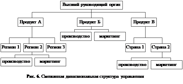 С точки зрения местных факторов использование территориальной организационной структуры приобретает некоторые дополнительные плюсы. Это вызывает создание новых рабочих мест для местного населения, не говоря уже об экономической выгоде, а именно снижении транспортных расходов, ренты, стоимости рабочей силы. Преимущества территориальной организации сбытовой деятельности заключаются в основном в экономии средств и высокой эффективности работы. Сбытовой персонал может уделять больше времени продаже товаров и сократить затраты на передвижение. Кроме того, будучи ближе к покупателям, он получает возможность изучить их потребности, рыночные предпочтения и выяснить, какая рыночная стратегия будет иметь наибольшие шансы на успех. В крупных диверсифицированных компаниях появляются дивизиональные структуры смешанного типа, сочетающие как продуктовый, так и территориальный принципы построения (рис. 6).