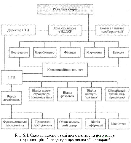 До складу комітету, як правило, входять усі члени правління, а також провідні спеціалісти технологічного відділу, відділу маркетингу. Рекомендується на засідання комітету запрошувати керівників виробничих підрозділів, на які буде покладатись основний обсяг роботи з розробки і реалізації інновацій. Запрошені наділяються тими ж правами при обговоренні рішень, що й постійні члени комітету. Комітет приймає рішення відносно того, чому віддати перевагу: зосередитись на продуктових чи процесних (технологічних) інноваціях. Далі вище керівництво (рада директорів) оцінює, буде це технологічне чи ринкове лідерство, чи «прямування за лідером», імітація, пошук «ніші» чи якась інша стратегія. У зв'язку з вибраною стратегією визначаються можливості фірми відносно масштабів інноваційної діяльності, оцінюється прийнятливий рівень технологічного, фінансового і маркетингового ризику. При цьому враховується можливість використання «запозичених» і власних технологічних рішень. Після цього розроблюються і затверджуються плани НДДКР, приймається рішення про початок виробництва нової продукції. Поточне керівництво покладається на віце-президента з НДДКР, який нерідко є і директором НТЦ. Координаційний комітет— консультативний орган, що виконує функцію узгодження інтересів. Він складається з представників керівництва НТЦ, виробничих відділень, служб постачання, фінансів, маркетингу, продажу. Кожна служба корпорації, кожен підрозділ несе відповідальність за певну її функціональну сферу діяльності (частина інноваційного процесу). Будь-яка ініціатива посилається на узгодження і затвердження лінійно знизу вверх. У цій традиційній формі переважає механістична система управління. Це означає проведення НДДКР, забезпечення їхнього зв'язку з виробництвом і маркетингом переважно силами самого НТЦ, тобто штатним персоналом на власній матеріально-технічній базі. У табл. 9.1 подана відповідальність різних служб НДДКР та їх координація. До основних функцій лабораторії належать: • розробка нових видів продукції, що можуть бути виготовлені на діючих виробничих лініях; • поліпшення існуючих видів продуктів і процесів для підвищення їхньої якості; • рішення виникаючих науково-технічних проблем на підприємствах (зокрема, у цехах), що входять у виробниче відділення; • надання технічних послуг і обслуговування замовників. Особливий підхід до інноваційної діяльності в сучасній великій корпорації полягає в централізації проведення фундаментальних досліджень і посиленні децентралізації розробок та поточного вдосконалювання продукції і процесів (рис. 9.2). На думку керівників фірм, що дотримуються принципу децентралізації управління, розукрупнення величезних науково-технічних комплексів прискорює процес вирішення організаційних питань, поліпшує якість контролю, підвищує ефективність НДР.