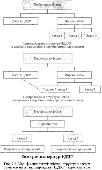 Організаційна структура НДДКР— це сукупність наукових, конструкторських, проектних, технологічних та інформаційних підрозділів (лабораторій, відділів, секторів, груп), які здійснюють основну творчу діяльність, спрямовану на створення інтелектуального продукту — інновацій, а також виробничих, допоміжних і управлінських підрозділів, які забезпечують виконання планів НДДКР та реалізацію створених інновацій. Одна з основних проблем управління інноваційною діяльністю у великих промислових фірмах полягає, з одного боку, в поєднанні рентабельного виробництва і поліпшення освоєння продукції, а з іншого — в активному проведенні НДДКР, підтримці науково-технічного наробку на перспективу, швидкому відновленні асортименту продукції, що випускається, і застосовуванні нових технологій. Необхідність поєднання масового виробництва та інтенсивної інноваційної діяльності висвітила цілий ряд організаційно-управлінських проблем, в основі яких лежать розбіжності між якісними характеристиками стабільних виробничих та інноваційних процесів і відповідно підходами до управління ними. Серед цих проблем: питання взаємодії різних форм організації виробничо-господарської діяльності в рамках корпорації; застосування різних систем управління; формування організаційних структур відповідного типу; міжфункціональна взаємодія всіх елементів інноваційного процесу; визначення ролі і місця фундаментальної науки в комерційній фірмі. Вважається, що для успішної діяльності у сфері наукових досліджень важливо не допускати старіння організаційних структур і забезпечити відповідний баланс між спеціалізацією й інтеграцією в роботі. У 80-ті роки виникли і набули розвитку інтегровані системи управління процесом інновацій, які виокремились із загальних систем управління виробництвом і випуском традиційної продукції. Розробка і впровадження інновацій перетворились у неперервний управляючий процес, коли інноваційні ідеї інтегруються в перспективні виробничі плани і програми. Нові системи управління інноваціями були прийняті у великих компаніях — «ІБМ», «Дженерал електрик», «Мацусіта», «Міцубісі», «Соні» та ін. Було вирішене питання відокремлення підрозділів, які мають справу з інноваціями і перспективними напрямами інноваційного розвитку фірми, що спростило процес прийняття рішень, систему планування і стимулювання, прискорило розробку й упровадження нової продукції. Особливістю організації НДДКР у промислових фірмах стало підпорядкування схеми організаційної структури завданням забезпечення тісного зв'язку між програмою НДДКР і виробництвом, скороченням циклу дослідження та упровадженням наскрізного управління від виникнення ідеї до її реалізації. Існують певні розбіжності в методах роботи і в організаційних формах залежно від того, чи є дане дослідження за своїм характером науковим чи технічним, ставить воно за мету збільшення знань у певній галузі чи вирішення певного практичного завдання. Розрізняють два типи організації наукових досліджень: програму і проект: програма — це робота в якій-небудь одній галузі, і звичайна більшість функціональних досліджень є програмними; проект являє собою пошук рішення певного актуального питання у визначений час і певними засобами. Концепція управління проектами стала сучасною
