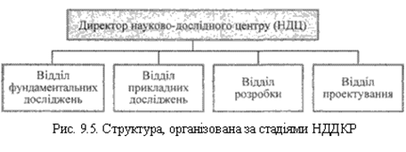 Фазна структура, або структура, що організована за стадіями НДДКР і передбачає таку форму розподілу праці, коли створюються підрозділи теоретичних і пошукових досліджень, інженерно-технологічних розробок, проектування, створення дослідних зразків і т. д. Тобто фазна структура дає змогу вченим вести наукову роботу, а інженерному складу— цілком присвятити себе роботі відповідно до своєї спеціалізації. Недоліком цієї структури є відсутність гнучкості, особливо в разі частої зміни продукції, що випускається. Ця структура виправдовує себе в галузях, де одна й та сама продукція випускається тривалий час. На рис. 9.5. показана організаційна структура за стадіями НДДКР.