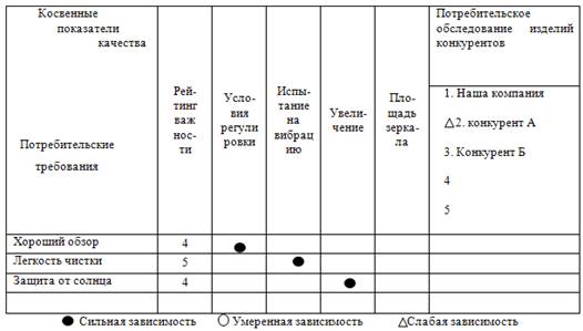 Отсюда видно, что существует сильная связь между "легкостью регулирования" и "усилием регулирования", "легкостью определения расстояния" и "увеличением" и т.д. Почти все покупательские требования "закрыты" сильными связями с показателями качества. В то же время 3 из 4-х показателей качества имеют сильную взаимосвязь с требованиями покупателя, а 1 - умеренную, что также говорит о правильном выборе системы показателей качества.