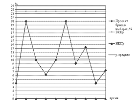 Из рисунка видно, что в процессе производства анилина появление дефектов имеет скачкообразный характер. Причинами этого могут быть изменения в составе сырья или технологии, неполадки в контролирующем оборудовании и др. Таким образом, процесс нестабилен, и нормализировать его можно после анализа причин появления дефектов.