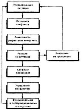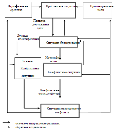 Рис. 1. представляет модель конфликта как процесса. Из нее видно, что существование одного или более источников конфликта увеличивает возможность возникновения конфликтной ситуации в процессе управления. Однако, даже и при большей возможности возникновения конфликта, стороны могут не захотеть реагировать так, чтобы и дальше усугублять ситуацию. Одна группа исследователей обнаружила, что люди не всегда реагируют на конфликтные ситуации, которые влекут за собой малые потери или которые они считают малоопасными. Однако, во многих ситуациях человек будет реагировать так, чтобы не дать другому добиться желаемой цели [8].