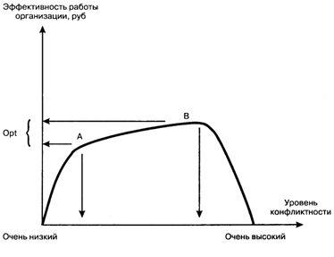 Конфликт — это отсутствие согласия между двумя или более сторонами. Из графика (рис. 2) видно, что бесконфликтность (безразличие всех ко всему) и очень высокая конфликтность обусловливают снижение эффективности деятельности организации. Таким образом, существует оптимальный уровень конфликтности (зона от точки А до точки В), обеспечивающий нормальное функционирование организации. Если конфликтная ситуация находится под контролем руководства, то такие конфликты называют функциональными. Они оказывают положительное воздействие на эффективность организации и полезны для нее (диапазон АВ). Функциональные конфликты могут возникать на совещаниях, советах, в деловой полемике и т.д. Участвующие в них стороны обычно контролируют себя и ситуацию. Если ситуация выходит из-под контроля руководства, конфликт принимает дисфункциональный характер. Дисфункциональный конфликт приводит к снижению личной удовлетворенности сотрудников, эффективности группового сотрудничества, ведет к враждебности в отношениях, к несправедливости в распределении ресурсов, вынуждает поступать против своей воли в пользу одной из сторон [1].