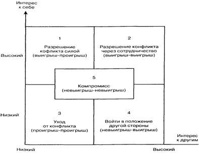 Конфликтным процессом в организации вполне можно управлять. У руководителя есть возможность предвидеть начало конфликтной ситуации, вовремя вмешаться в процесс протекания конфликта, внести свои коррективы и вывести конфликтную ситуацию к оптимальному разрешению. Определяя поведение в конфликте, руководитель должен в первую очередь выяснить причину конфликта, определить цели оппонента (или оппонентов), наметить сферы сближения точек зрения с оппонентом, уточнить поведенческие особенности оппонента. При этом важно помнить, что точно так же, как ни один стиль руководства не может быть эффективным во всех без исключения ситуациях, так и ни один из стилей разрешения конфликта (будь то конкуренция, сотрудничество, компромисс, уклонение, приспособление) не может быть выделен как самый лучший.