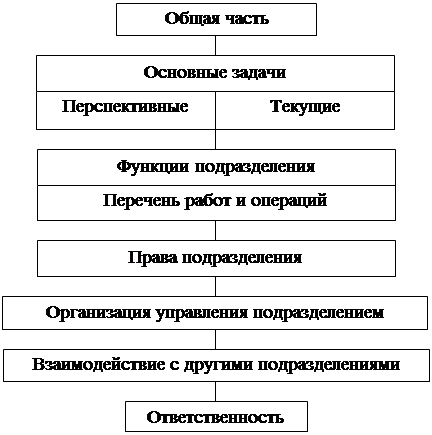 Важнейшим внутренним организационно-регламентирующим документом является Положение о подразделении - документ, регламентирующий деятельность какого-либо структурного подразделения кадровой службы: его задачи, права, функции, ответственность. На схеме представлена типовая структура положения об отделе.