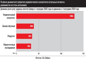 У кадровых агентств постепенно расширяется доля дополнительных направлений деятельности. Если в первом полугодии 2004 года выручка от подбора персонала в общей структуре поступлений составляла 53%, то в первом полугодии 2005−го - только 42%. Особенно динамично развивается управленческий консалтинг, поступления от которого выросли по сравнению с предыдущим периодом на 130%. Такого результата агентствам удалось добиться благодаря 50 реализованным консалтинговым проектам (в прошлом году - 31).