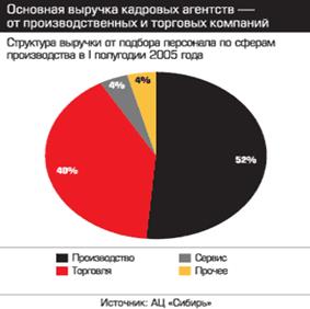 Основная доля в выручке кадровых агентств приходится на производственный сектор (52%) и торговлю (40%).