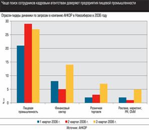 Данный график отражает поквартальный уровень спроса на услуги поиска персонала различных секторов экономики. Пищевая промышленность пользуется данными слугами чаще остальных.