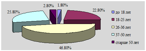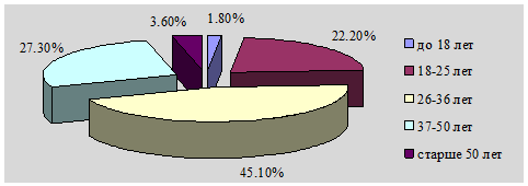 Из данных аналитической таблицы 2 видно, что на предприятии удельный вес рабочих в 2007 году ниже его величины в 2006 году на 0,4%. Соответственно, увеличился на 0,4% удельный вес ИТР, в том числе специалистов - на 0,6%, служащих - на 0,1%, а руководителей снизился на 0,3%. Проведем анализ состава промышленно-производственного персонала по возрасту, полу, профессиональным группам, образованию, квалификации и стажу работы. Анализ состава промышленно-производственного персонала ОАО "Клецкий маслодельный комбинат" по возрасту представлен в таблице 3. Аналогичные результаты демонстрирует и анализ структуры работников ОАО "Клецкий маслодельный комбинат" по возрасту (рисунок 3 - 4).