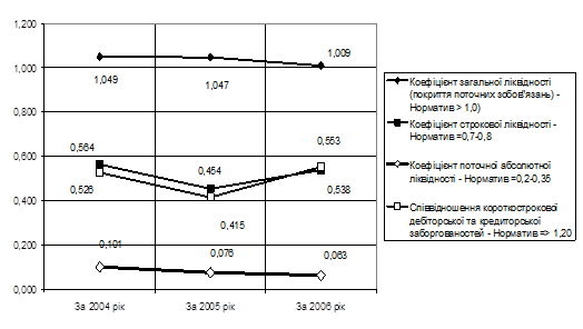 - у 2004 – 2006 роках показник відношення короткострокової дебіторської та кредиторської заборгованостей був суттєво нижче значення стійкого діапазону (більше 1,0), тому для розрахунків з кредиторами необхідно було не тільки отримати кошти дебіторської заборгованості за відпущені товари, але і реалізувати частину продукції, яка знаходилась в товарних запасах та ще не була продана;