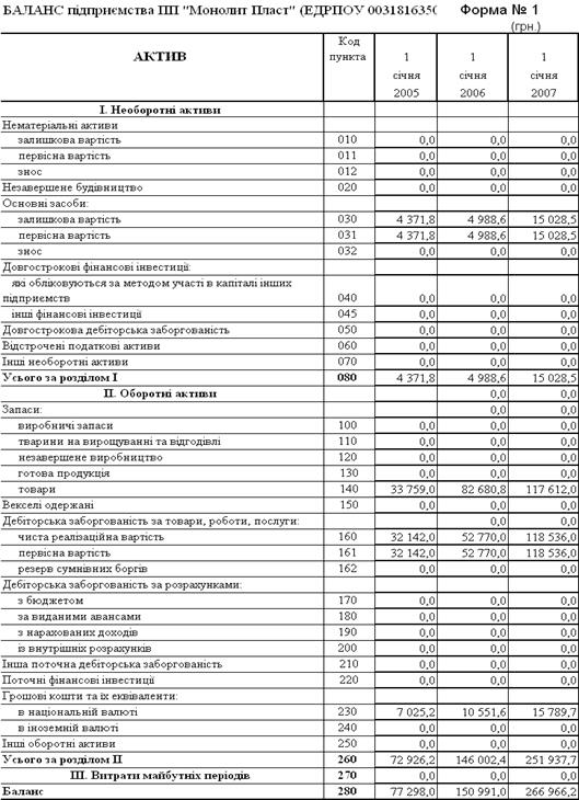 Таким чином, у 2004 – 2006 роках підприємство ПП "Монолит Пласт" почало і продовжує свою діяльність в в кризовій полосу неліквідності балансу в короткострокових та довгострокових періодах, що зафіксовано у раніше вказаному факті використання у 2004 - 2006 році грошової маси на закупівлю товарних запасів.