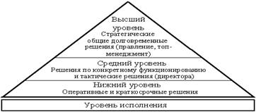 Иерархия управления - инструмент для реализации целей фирмы и гарантия сохранения системы. Чем выше иерархический уровень, тем больше объем и комплексность выполняемых функций, ответственность, доля стратегических решений и доступ к информации. Одновременно растут и требования к квалификации и личная свобода в управлении. Чем ниже уровень, тем больше простота решений, доля оперативных видов деятельности.