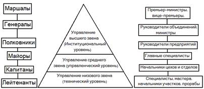 По уровню управления руководители подразделяются на руководителей различных звеньев. К низовому относят мастеров, начальников участков, отделений, цехов, бюро, отделов, групп на предприятии. К среднему - руководителей предприятий и организаций, их заместителей. К высшему относят руководителей министерств и ведомств, крупных объединений, их заместителей. Уровни управления представлены на рис. 2, где отражена некоторая аналогия между иерархией уровней управления и иерархией воинских званий.[20, с. 17 ]