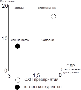 ОДР ниже единицы свидетельствует о слабых конкурентных позициях на рынке. Чем больше ОДР превышает единицу, тем более высокой является конкурентоспособность данного предприятия или отдельного СХП. Использование относительной доли рынка в качестве оценки рыночной позиции предприятия в матрице БКГ является более обоснованным по сравнению с показателем рыночной доли.