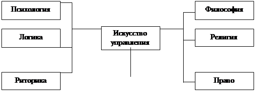 Искусство управления — способность человека принимать нетривиальные решения в условиях дефицита информации и времени. В основе его лежат методология и принципы науки управления, которая, в свою очередь, является дисциплиной периода интеграции наук и опирается на достижения теории автоматического регулирования, теории информации, кибернетики, экономики и реагирует на изменения основных концепций политической жизни общества. Одновременно искусство управления впитало в себя мировые достижения психологии, логики, риторики, этики, философии, права, а также методы воздействия на алчность и социум различных религиозных конфессий (рис. 1).
