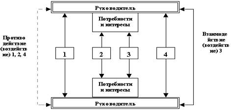 Взаимодействие между руководителем и подчиненным при реализации данной технологии может возникнуть только при условии, что воздействие затрагивает потребности и интересы, как самого руководителя, так и подчиненного (вариант воздействия 3 на рис. 5). Все остальные варианты воздействий (1, 2, 4) приводят к противодействию подчиненного.