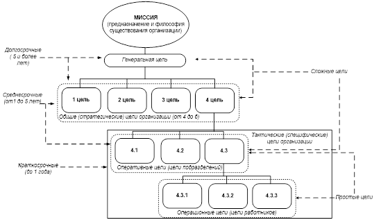 Как правило, система целей организации, представляет собой строго иерархическую структуру, где цели более низкого уровня менее масштабны, более многочисленны и детализированы, чем цели вышестоящего уровня, при этом, они являются средствами для достижения целей более высокого уровня. Являясь на первый взгляд простой, система целей имеет разветвлённую и многоуровневую древовидную структуру, в которой цели дополняют друг друга. И чем выше по уровню цели, тем меньшим числом связей с нижестоящими целями они обладают.