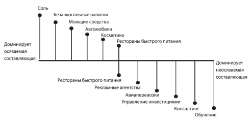 Рассмотрим шкалу осязаемости / неосязаемости товаров и услуг, приведенную в книге В. Зейтамль и М. Битнер "Маркетинг услуг" (см. рисунок). Как мы видим, тренинг - самое явное воплощение услуги. Перефразируя Лема, можно сказать, что тренинговые услуги неосязаемы в гораздо большей степени, чем все остальные "неосязаемые" услуги. Почему это так?
