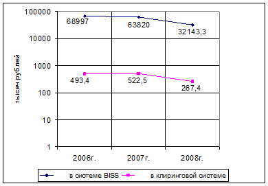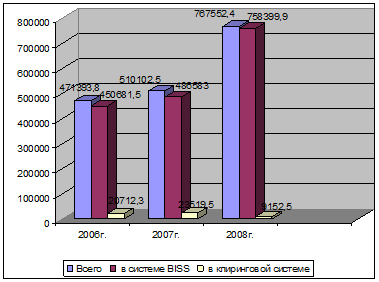В автоматизированной системе межбанковских расчетов проведено 12651,2 тысячи платежей на сумму 233288,1 миллиарда рублей. Средний размер платежа в отчетном периоде по сравнению с аналогичным периодом 2007 года возросло на 1,7 %. Количество проведенных платежей в отчетном периоде по сравнению с аналогичным периодом 2007 года возросло на 9,5%, сумма – на 17,1%. В январе-сентябре 2009 г. среднедневной оборот составил 3762,7 млрд. руб.(204,1 тыс. платежей) и по сравнению с январем-сентябрем 2008г. увеличился соответственно на 17,4% и 9,7% (Приложение Г).