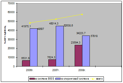 За январь-сентябрь 2008 года по сравнению с аналогичным периодом 2007 года платежный оборот в целом вырос на 9,5 процента по количеству и на 17,1 процента – по сумме, а среднедневной оборот – на 9,7 и 17,4 процентов соответственно [25].