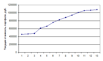 По итогам управления портфелем получена прибыль в размере 1809504 руб., что соответствует 538,8% годовых. Следует отметить, что полученная доходность выгодно отличается от определенных при формировании портфеля ожидаемой, средней и даже возможной доходностей. В принципе, чем ниже устанавливается значение ожидаемой доходности, тем больше возможностей для маневра имеют брокеры и тем больше (как правило) шансов на успех.