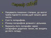 При введенні поняття логарифму і властивостей логарифмічної функції необхідно значну увагу приділити вмінню застосовувати основну логарифмічну тотожність, а також формулу переходу від однієї основи логарифма до іншої.