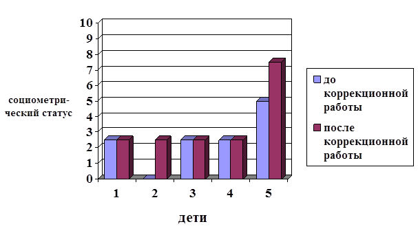 На контрольном этапе эксперимента мы отметили увеличение количества положительных выборов и уменьшение количества отрицательных у некоторых детей, что свидетельствует о расширении круга общения этих детей, а следовательно – о возрастании уровня владения коммуникативными умениями и навыками. Кроме того, если до коррекционной работы в статусных категориях исследуемой группы выделялись «принятые», «непринятые» и «изолированные» дети, то после – только «принятые» и «непринятые».