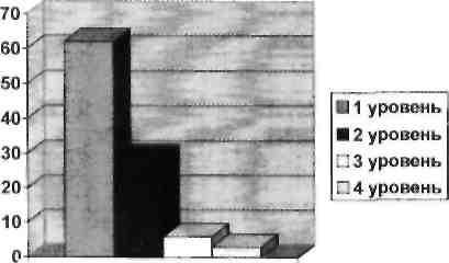 Из диаграммы видно, что детей с первым (низким) уровнем развития наблюдательности - 62 %, со вторым уровнем - 29 %, с третьим - 6 %, с четвёртым - 3 %.