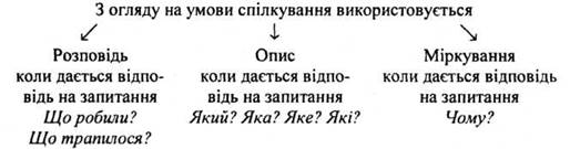 — пейзажно-ліричним жанрам; міркування — науковим та публіцистичним творам. Але це не означає, що в усіх перелічених видах літературних творів не використовуються інші типи мовлення. Будь-який цілісний твір не може складатися лише з одного типу мовлення. Зазвичай ознаки, властиві цим різновидам, завжди проявляються комплексно. В реальному звуковому потоці такі типи мовлення — не випадкові відрізки: це контексти з конкретним, визначеним загальносмисловим змістом і відповідним мовним оформленням. Загальносмислові значення з певною мовною структурою типізовані. Отже, вони стали стабільними функціонально-смисловими типами мовлення.