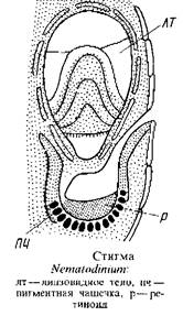 Глазки, расположенные вне хлоропластов у основания жгутиков, также отличаются большим разнообразием: от простейшего глазка в виде массы глобул {Woloszynskiacoronata) до сложной светочувствительной органеллы, состоящей из стекловидной, преломляющей свет линзы и пигментного тела, например у рода эритропсис. У нематодиниума стигма тоже состоит из прозрачного линзовидного тела, окружающей его снизу пигментной чашечки и расположенного на дне этой чашечки светочувствительного ретиноидного тела. Линза точно фокусирует свет на дне пигментной чашечки. С физической точки зрения была доказана возможность получения изображения объекта на ретиноидиом слое.