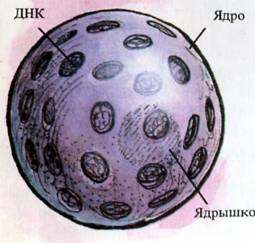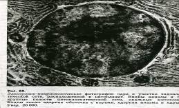 отделяет ядро от цитоплазмы, и в световой микроскоп она видна как очень тонкий контур. При увеличении электронного микроскопа в 40000—50000 раз хорошо видно, что ядерная оболочка состоит из двух мембран — наружной и внутренней, а между ними находится узкое пространство, заполненное полужидким веществом. Наружная и внутренняя мембраны ядерной оболочки имеют трехслойное строение и по этому признаку сходны как с наружной мембраной, так и с мембранами других органоидов клетки. В ядерной оболочке находится множество мельчайших пор, через которые из ядра в цитоплазму и обратно поступают белки, углеводы, жиры, нуклеиновые кислоты, вода и разнообразные ионы, т. е. осуществляется непрерывный обмен веществ между ядром и цитоплазмой. ,