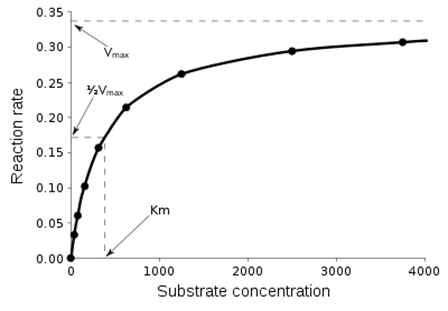 Крива насичення хімічної реакції (рівняння Міхаеліса-Ментен), що ілюструє співвідношення між концентрацією субстрата [S] і швидкістю реакції V.(Рис.2) Найпростішим і найпоширенішим описом кінетики односубстратних ферментатівних реакцій є рівняння Міхаеліса-Ментен. На сьогоднішній момент описано і кілька складніших типів кінетики ферментів. Наприклад, якщо реакція вимагає кількох молекул субстрата або різних субстратів, часто реакція протікає через утворення третинного комплексу. Для дії багатьох ферментів також типове утвореня перехідних комплексів (станів), що описується «механізмом пінг-понг».