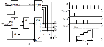 Рис. 2.5. Аналого-цифровий перетворювач послідовної лічби з ЦАП: а – схема; б – часові діаграми роботи