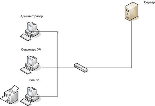 Все пользователи системы, а также сервера баз данных соединены в компьютерную сеть. Компьютеры пользователей соединены между собой устройством (Switch – 8 портовым), которое позволяет объединить компьютеры в небольшую локальную сеть. Общая пропуская способность сети составляет 10/100 Мбит/с и позволяет осуществлять полноценную загрузку сервера системы и использовать современное программное обеспечение. Это осуществляется с помощью сетевых кабелей неэкранированная витая пара(UTP— Unshieldedtwistedpair) пятой категории.