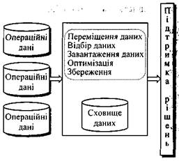є специфічною базою даних, яка проектується і наповнюється, щоб підтримувати створення рішень в організації. Це є пакет, своєрідна система керування базою даних, що існує окремо від оперативних систем, обновлюється і структурується для термінових оперативних запитів і управлінських підсумків. За змістом та часовим горизонтом вона відрізняється від оперативних систем. При цьому сховище даних є незмінним у часі, а, отже, здатним підтримувати різноманітні види аналізу. Переважно такі бази даних є архівами операційних даних, відібраних для забезпечення підтримки прийняття рішень та оптимізованих для взаємодії з СППР організації. На рис.1 зображена спрощена схема формування та використання автоматизованого банку даних. Дані беруться з різноманітних джерел оперативних даних. Після переміщення проводиться їх відбір для гарантування того, що вони мають достатню значимість, є безперервними і точними. Потім дані завантажуються в реляційні таблиці, які в змозі підтримувати різноманітні види аналізу та запитів, і оптимізуються для тих таблиць, які, як очікується, будуть найчастіше застосовуватися. І, нарешті, дані зберігаються для подальшого використання.