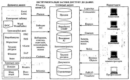 Важливим чинником стимулювання організації сховищ даних у корпораціях стала поява спеціального програмного забезпечення, призначеного для побудови та зберігання банках даних, а також для забезпечення доступу до них. Як видно із рис.2, до групи продавців цих програмних продуктів належать як добре відомі розробники СППР та ВІС (наприклад Pilot, Comshare, IRI) і баз даних (наприклад, Oracle, Focus), так і менш знайомі продавці (Red Brick, Platinum, Carleton), які мають значний вплив у сфері організації банків даних.